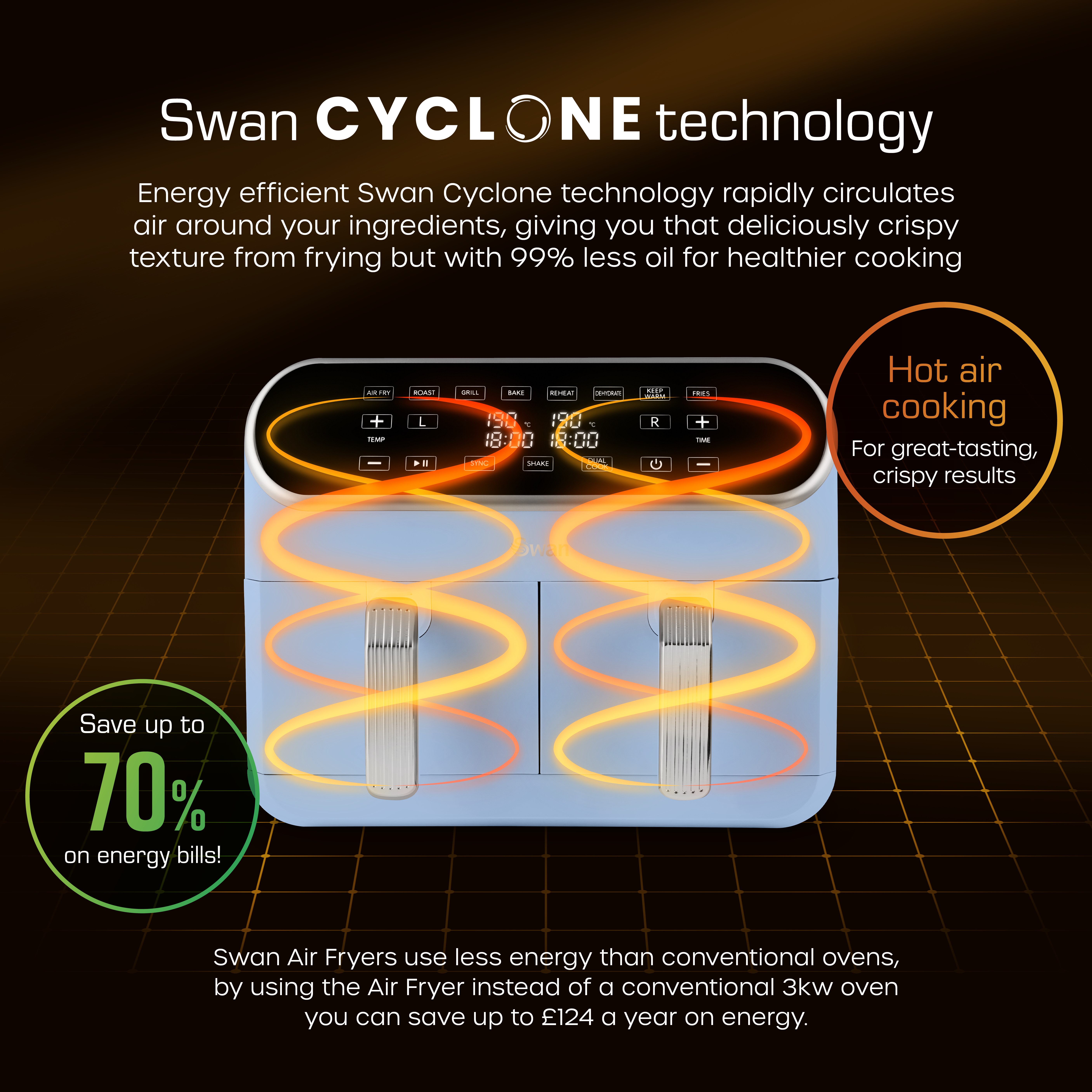 Swan Cyclone technology is a faster and healthier alternative to oven cooking. Requiring minimal oil, rapid air circulation evenly distributes heat around your food to get a deliciously crispy texture using 50% less energy and no excess oil. Reduce your bills, not the flavour.