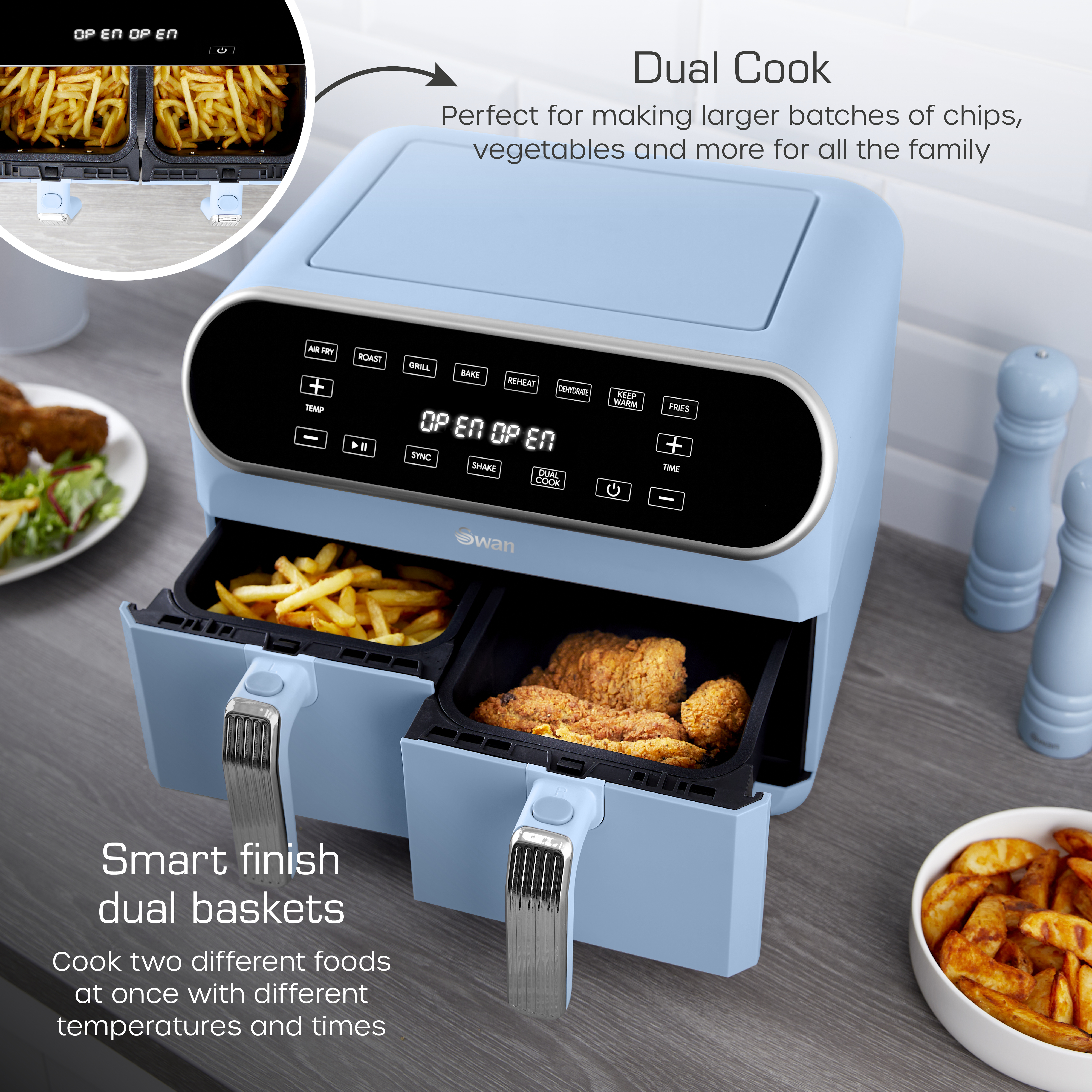 The Swan Retro blue dual basket digital air fryer is a faster, energy efficient alternative to traditional oven cooking. With Swan Cyclone Technology, a powerful fan rapidly circulates hot air around your food, giving you evenly cooked and deliciously crispy meals using 50% less energy. Air frying requires just a tablespoon of oil, if none at all, for healthier cooking without compromising on flavour and no excess grease. This digital air fryer features two 4 litre non-stick baskets, so you can cook two ingredients at once, making family cooking a breeze. The digital touch panel has 8 pre-set functions for Chips, Fish, Bacon, Vegetables, Toast, Chicken Wings, Steak, Prawns, Dehydrate, Bake, Keep Warm, and Defrost. This takes away guesswork for perfect results at the touch of a button. Also includes a shake reminder so you know when it’s time to shake the basket to ensure your food is evenly cooked. Smart Sync Finish cooks both baskets on different times and temperatures but finishes at the same time so you’re not waiting around for other food to be ready. Dual Cook lets you use both baskets to make larger portions of chips, vegetables and more. Whether you're experimenting with an air fryer recipe book or being creative, this dual basket air fryer can cook a wide range of meals. The baskets can be easily washed with warm soapy water or placed in the dishwasher. The Swan Retro collection is inspired by 1950s and 1960s design to compliment all kitchen decors.