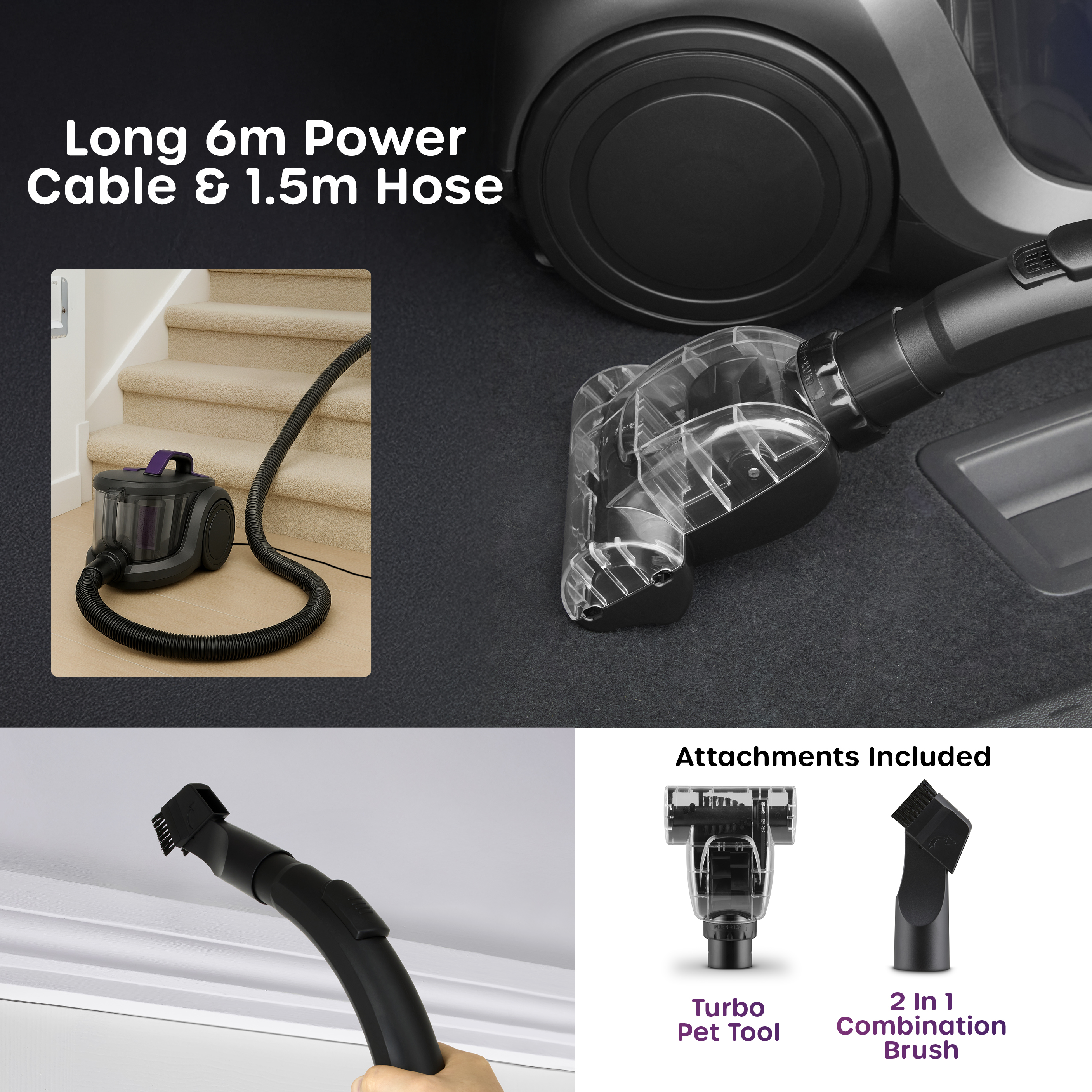 The Swan Dustmaster Cylinder Vacuum is the perfect compact cleaning companion. It’s packed with powerful suction and a 2-in-1 motorised floorhead, giving you maximum airflow to effortlessly remove the finest dust and debris particles from your floors for the ultimate deep clean. With a built-in advanced HEPA H12 filter, 99.5% of all known particles are eliminated by containing the collected dust mites, pet dander and pollen. This makes your home even fresher and healthier, so perfect if you live with allergies. The large 2 litre dust tank holds over twice the amount compared to leading cordless vacuums, giving you more than enough space for multiple cleaning sessions without emptying. It’s also bagless, meaning no replacement bags are needed – just empty the tank and it’s ready to use again. For more freedom of movement while you clean, the long 6m power cable and 1.5m hose with extension pole gives you more flexibility to clean around your home with minimal effort. For even more convenience, you can save yourself from back strain and manually wrapping up the power cord thanks to the automatic foot operated cord rewinder. With one simple push down, it reels back in, keeping the cord neatly stored away with no risk of tangling. This compact vacuum comes with a crevice tool to tackle hard to reach places like fabric folds and corners, along with a floorhead brush for larger surface areas.