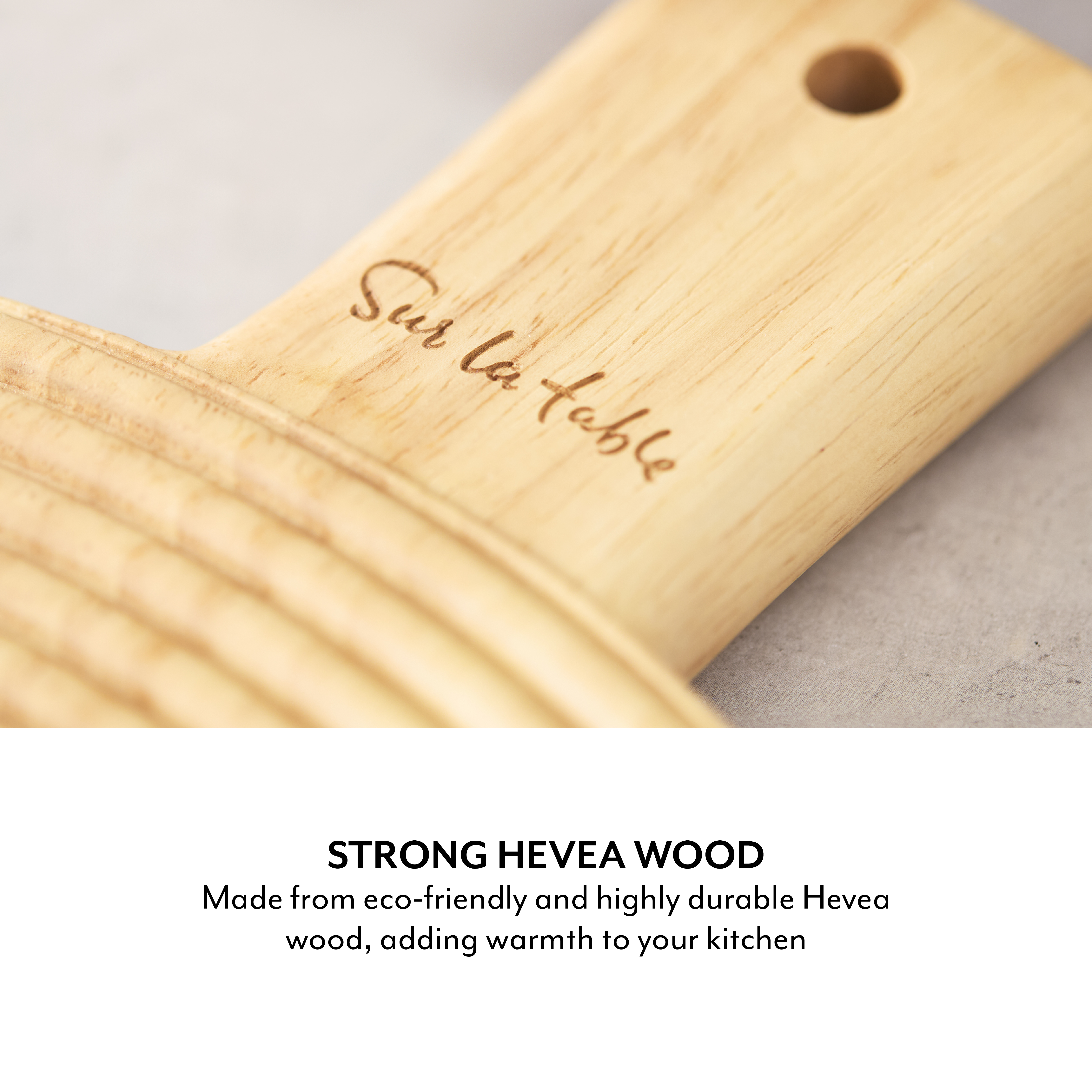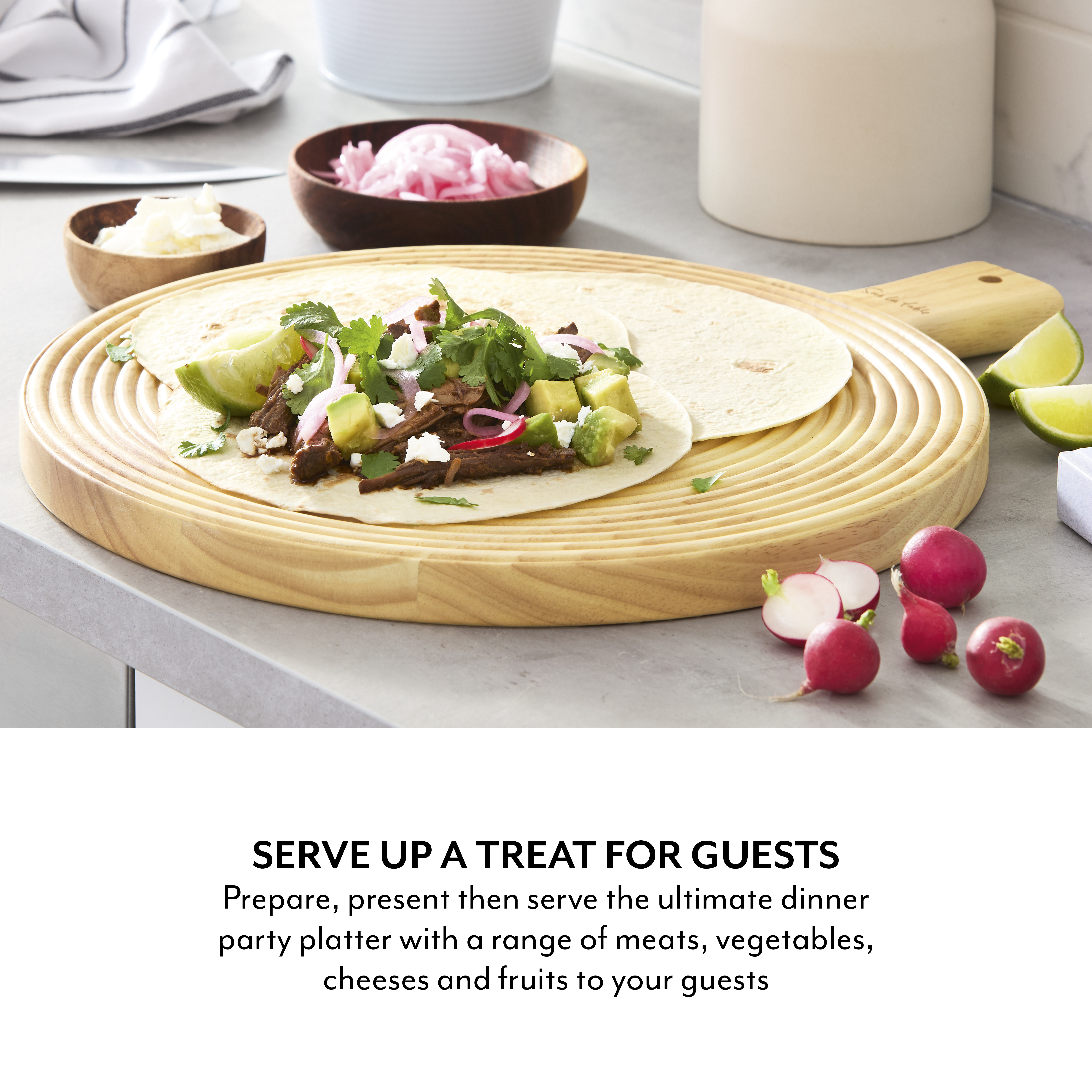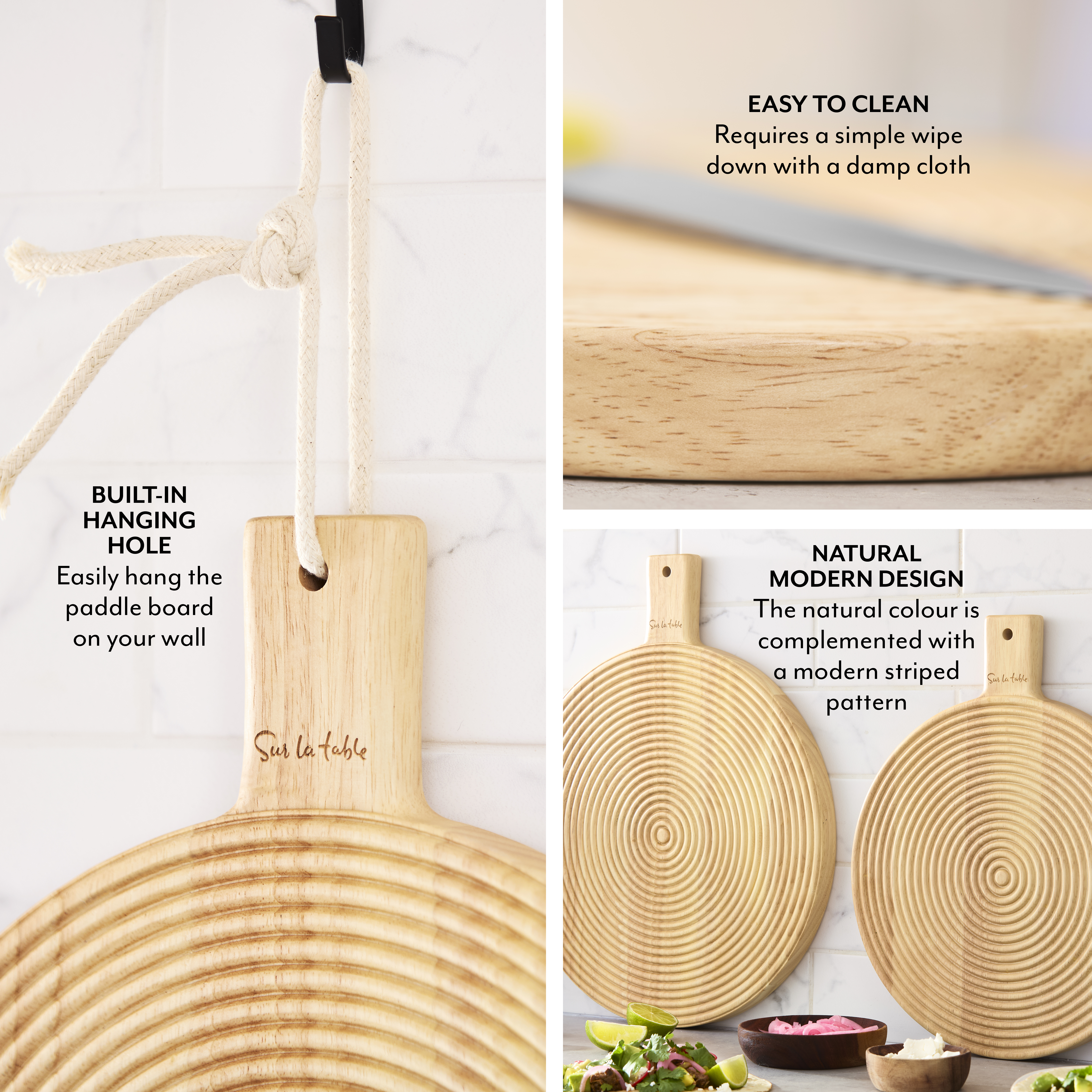 With over 50 years of cooking expertise, we at Sur La Table know what it takes to make mealtime memories with loved ones. If you love to play host, then serve up a treat using our large round paddle board from the Colour Me Happy range. Prepare, present then serve the ultimate platter filled with delicious meats, cheeses, vegetables, and fruits to your guests. It’s a great centrepiece when hosting a lunch or an evening meal. There’s a strong paddle handle, making it easy and comfortable to move from countertop to table. This serving board has been crafted from strong and durable Acacia wood, a wood with unique qualities that makes it not prone to warping or cracking. This board is built to last through years of gatherings, so perfect for the avid socialite. Its natural colour, paired with a modern striped pattern and textured finish, brings a touch of style to any spread. We know the importance of eco-friendlier living. Our serving board doesn’t just look great, it has been made exclusively from materials specially sourced and sustainable materials. Cleaning is also very easy, requiring just a simple wipe down with a damp cloth and it’s good to go again. Why not display the board proudly on your kitchen wall thanks to the built-in hanging hole. This is also gives you instant access to the paddle board, while saving you valuable cupboard space. Time to take your serving game to the next level.