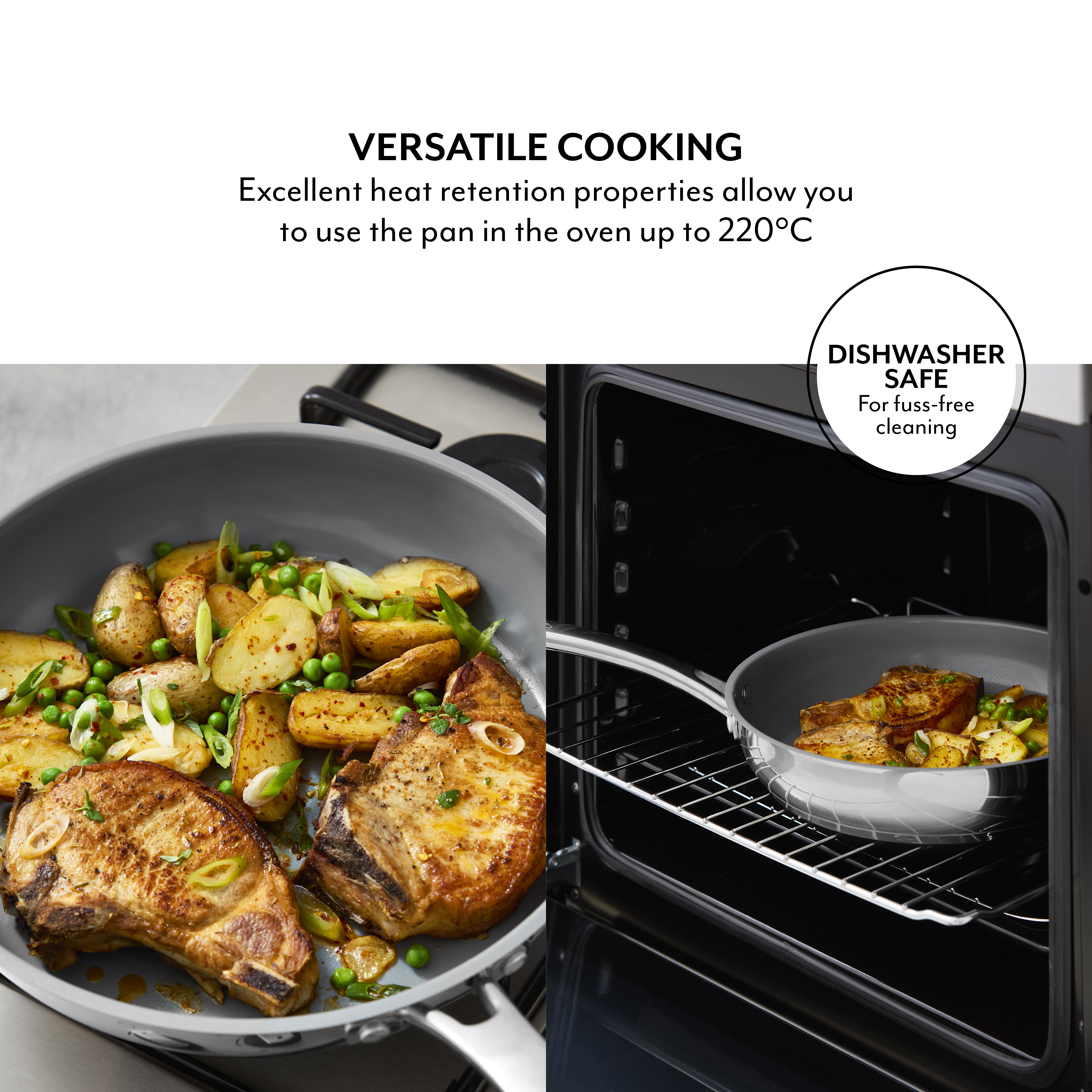 The stainless steel & aluminium encapsulated base provides superior heat conductivity and even heat distribution whilst the pan can be used on any hob type, including induction for versatile cooking. It is also safe to use the pan in the oven up to 220°C so you can easily add the finishing touches to your favourite dishes