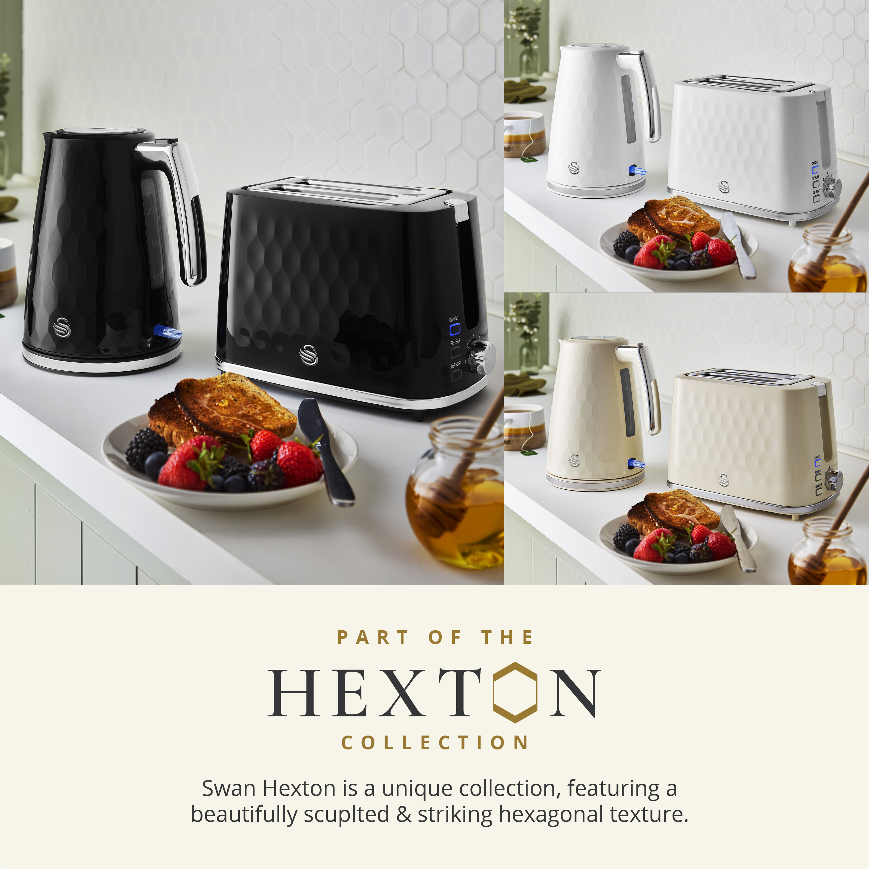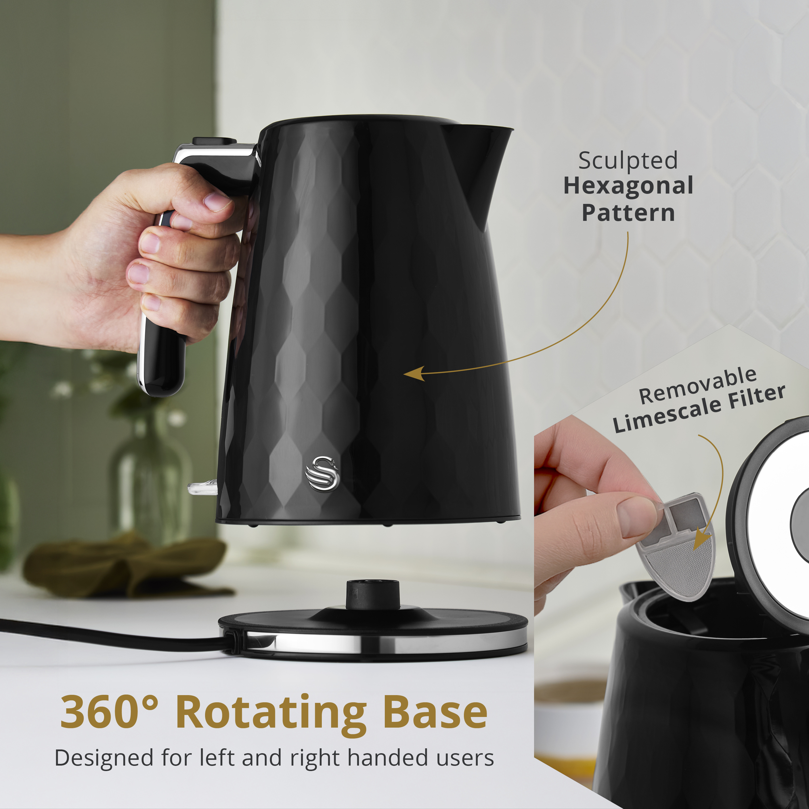 The Swan Hexton fast boil kettle pairs everyday practicality with a bold character statement to enhance your breakfast routine. Featuring rapid boil technology, a push-button flip lid, removable limescale filter and 360° base with tidy cord storage. This electric kettle features a 1.7 litre capacity for up to 7 cups - ready for busy mornings or entertaining guests. It’s all wrapped in a beautifully sculpted hexagonal pattern with chrome accents to make a statement on your worktop. A matching toaster is also available (sold separately).