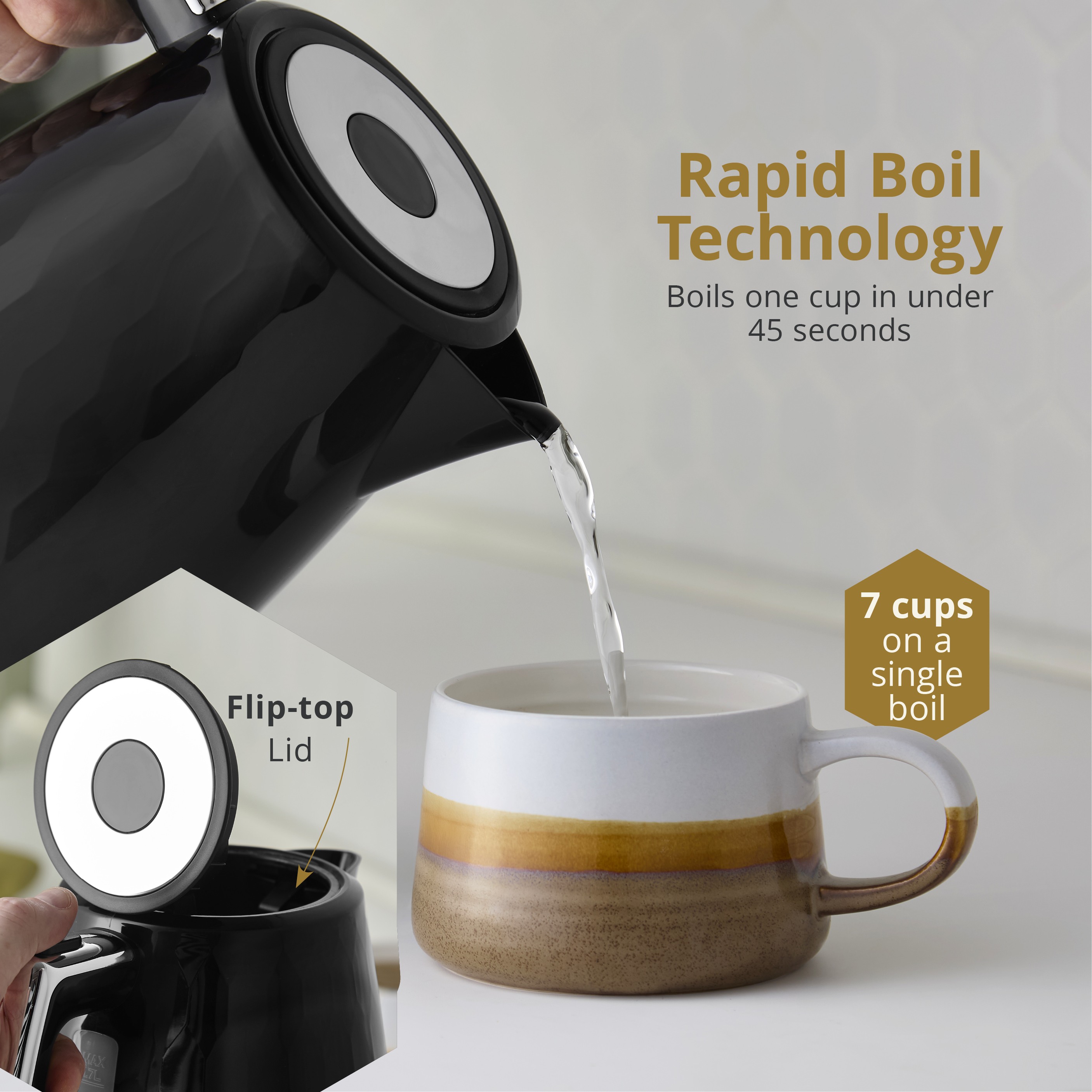 1.7L Capacity makes up to 7 cups from one boilFlip top style lid for easy filling